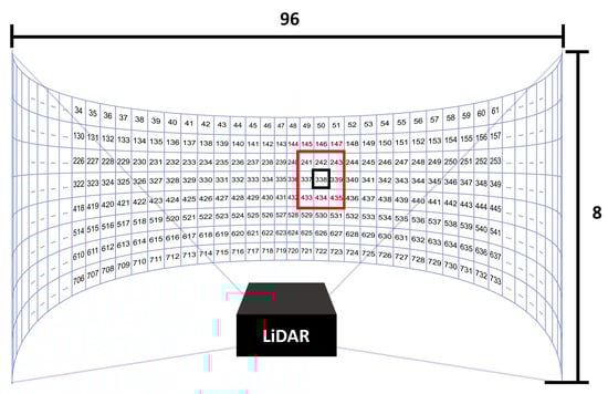 Figure 4 is a 2D-mapped solid-state LiDAR point cloud. The proposed algorithm is designed based on the hardware specifications of LeddarTech’s Pixell LiDAR. LeddarTech’s Pixell covers approximately 180 degrees and emits light from 768 points, distributed across eight vertical and ninety-six horizontal positions, after which, it measures the distance. Thus, indices are mapped to 768 pixels for the proposed clustering algorithm. Figure 5 illustrates the horizontal angle of the field and positions.