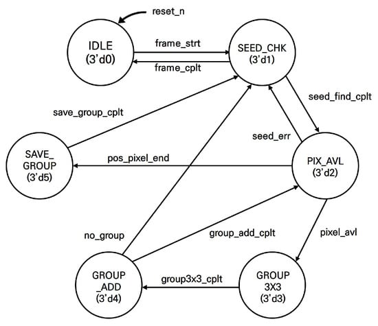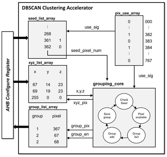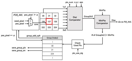 The grouping core performs DBSCAN clustering based on LiDAR’s point cloud data. The clustering process is divided into five main stages, shown as Figure 7, starting after the data are stored in the xyz-list and seed-list. These stages are seed-chk, pix-avl, group3x3, group-add, and save-group and the flow of the stages in the grouping core is illustrated in Figure 8. In the seed-chk stage, the grouping core sends a signal to the seed-list to get a seed pixel. If seed finding is complete, it goes to pix-avl stage. In the pix-avl stage, clustering determines which pixel is a core point, seed pixel or pos pixel. Pos-pixel comprises pixels included in the forming group. If the selected core pixel’s x, y, z coordinates are not dummy data, a calculating neighbor pixel is applied in stage group3x3. In group3x3, the distance is computed from the core pixel indicated as a red box in Figure 8 to up to eight surrounding pixels to determine if the number of points within the and compared with the number of pixels in group3x3, including the core pixel whether number meets or exceeds . If no group has formed, it goes to seed-chk and a seed-pixel is brought in as the new core pixel. If a group is forming, the group-add stage merges a newly formed small group to an existing group if one exists, or creates a new group if none exists. Once the group-add process is completed, it returns to the pix-avl stage and a pixel index from the pos-pixel group is designated as the core pixel. If no pos pixels remain for further core pixel evaluation after a group is formed, the process transitions to the save-group stage where the newly formed group is saved to the group-list. After the save-group is completed, the entire process is repeated until all pixels have undergone the grouping process. When clustering ends, a frame completion signal is sent to the group-list. Subsequently, the group-list is transmitted as per the core’s request.
