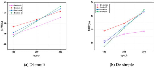 In all previous experiments, we set the number of buckets (stages in curriculum learning) to 3. In practice, the data can be divided into more groups to observe the model’s performance with different bucket numbers. Therefore, we used Distmult and De-SimplE as the base model and ICEWS14 as the dataset to conduct experiments with 3, 4, and 5 buckets. The results are shown in Figure 2.