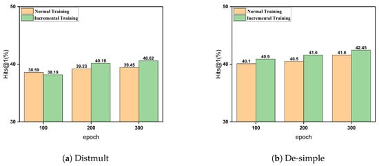 As shown in Figure 3, the incremental training strategy achieves Hits@1 scores of 40.9%, 41.6%, and 42.45% after 100, 200, and 300 epochs, respectively. In comparison, the baseline strategy of uniform training across all buckets yields lower Hits@1 scores of 40.1%, 40.5%, and 41.5% at the same epochs.