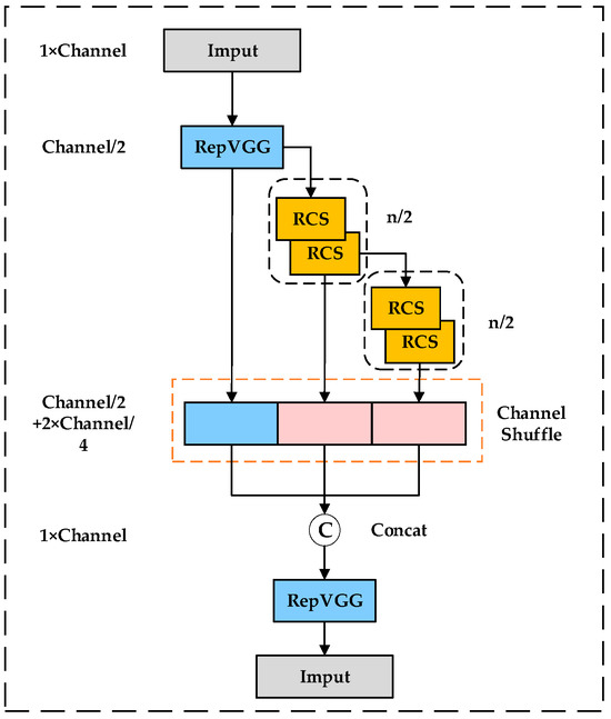 The RCS module [22] combines channel shuffle strategies with reparameterization convolution to enhance feature extraction capabilities. During training, a multi-branch structure is used to learn rich feature representations. In the inference stage, structural reparameterization simplifies it into a single branch, reducing memory usage. The OSA module aggregates multiple features in one go and, combined with the RCS module, forms the RCS-OSA module [23], as shown in Figure 4. The input to the RCS-OSA module is divided into two parts: one part passes directly, and the other is processed through stacked RCS modules. The processed features are merged with the directly passed features after channel shuffling. This structure, by stacking RCS modules, ensures feature reuse and enhances information flow between different layers while reducing the network’s computational burden and improving computational efficiency.