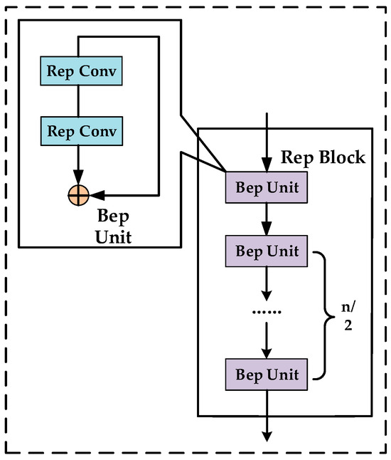 After connecting two Rep CONVs in series with the identity residual structure, a Bep unit is obtained. By connecting multiple Bep units in series, a Rep Block [25] is obtained, and its structure is shown in Figure 6. The Rep Block gives full play to the advantages of the Bep unit residual structure, and retains the advantages of the branch model’s powerful representation ability while simplifying the network, so that the model can more effectively capture and learn complex features in the input data.