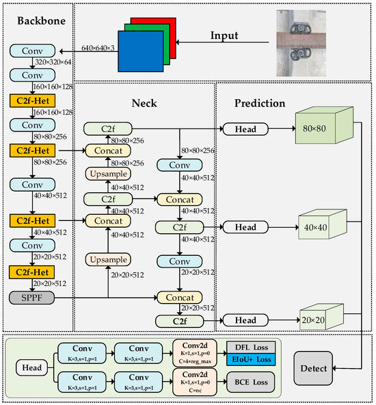 In YOLOv8, the C2f module’s cross-stage connection approach leads to additional computational costs, especially when handling large-size input images, increasing the network’s computational complexity and memory consumption, and causing incomplete information transfer. Thus, the C2f-Het module is designed to replace the C2f module in the backbone network, enhancing information flow between different layers while maintaining performance and reducing computational complexity. The improved YOLOv8n-S network structure, utilizing the enhanced EIOU+ loss function as the regression box localization loss function, is shown in Figure 7.