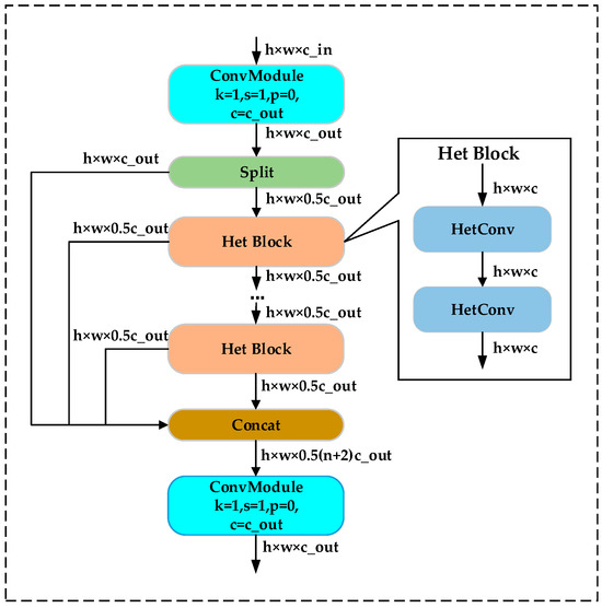 To ensure smoother information flow between different layers of the backbone network, improving feature extraction capabilities while maintaining low computational costs, the C2f-Het module designed with Het Conv filters, as shown in Figure 9, replaces the C2f module in the student model’s backbone network.