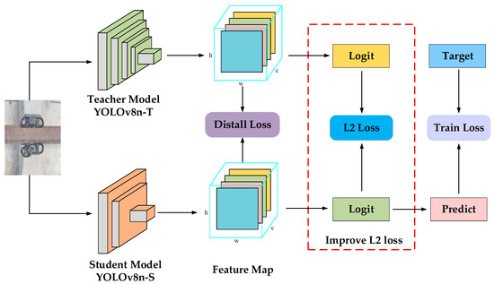 Due to the small difference between the normal fastener and the shifted fastener of the rail fastener, there will be false detection. Based on this, L2 loss is designed in this paper to further optimize the CWD distillation algorithm, as shown in the red dashed box in Figure 10. The mean square error loss of layer i is calculated by Formula (8), and the final loss of Formula (9) is obtained by summing the losses of all layers.