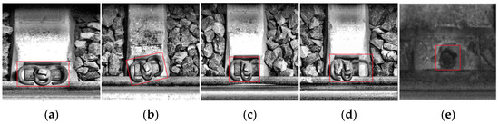 Data set sample. (a) Normal fastener image; (b) Shift fastener image; (c) Broken fastener image; (d) Deformed fastener image; (e) Missing fastener image.