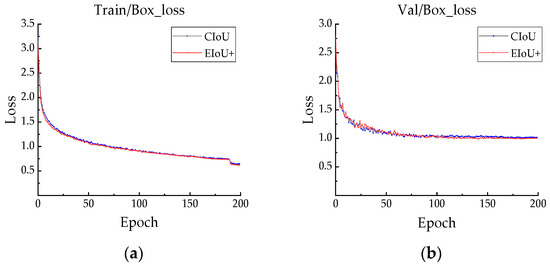 The training process visualization of the EIOU+ and CIOU loss functions in Figure 12 shows that the EIOU+ loss function converged faster in the first 50 epochs on the training set, eventually stabilizing at 180 epochs. On the validation set, the EIOU+ and CIOU loss functions showed minor differences in the first 100 epochs, with the EIOU+ loss function converging more significantly and achieving a lower loss value after 100 epochs.