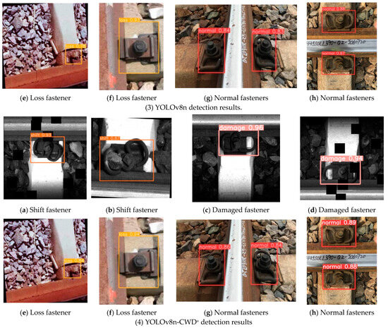 The improved model’s comparative experimental results prompted the selection of YOLOv3-tiny, YOLOv5s, YOLOv8n, and the distilled YOLOv8n-CWD+ models for a visual analysis of track fastener detection. Random samples of track fasteners from various angles and states were chosen for this analysis. A confidence threshold of 0.5 and an IOU threshold of 0.7 were set for comparative validation. The detection results for images taken from different angles are shown in Figure 13. From the detection results of YOLOv3-tiny in Figure 13(1), it is evident that the displaced fastener in image (b) was missed. While the fastener’s condition in image (d) was correctly identified, the fastener was not fully localized. In image (f), a missing fastener was incorrectly detected as a normal one, with a relatively low confidence score. As indicated by the results in Figure 13(2), the YOLOv5s model was able to correctly identify the fastener’s condition, with an improvement in confidence scores compared to YOLOv3-tiny. Figure 13(3) presents the detection results of YOLOv8n, which correctly identified the track fastener’s condition with higher confidence scores than those of YOLOv3-tiny and YOLOv5s. The detection results for YOLOv8n-CWD+ are illustrated in Figure 13(4), where the algorithm accurately detected the true condition of the fasteners, with significantly higher confidence scores compared to the other three models. The improved distillation algorithm achieves high detection rates and high accuracy in track fastener condition detection.