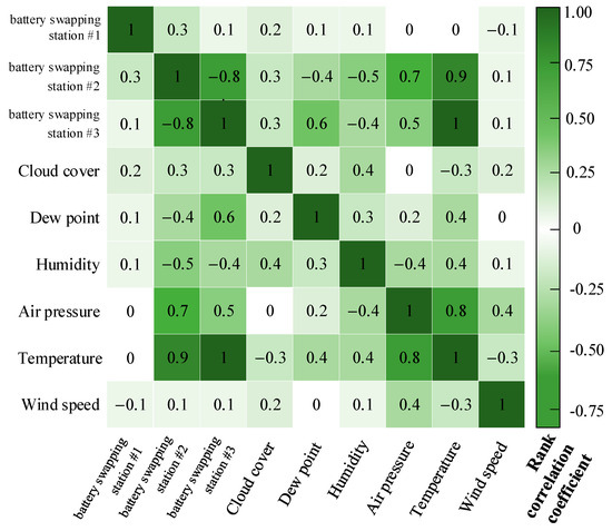 This research utilizes a public dataset from a city in Northeast China, encompassing load data from public EVBSSs for the first quarter of 2022, sampled at 60 min intervals. Concurrent local meteorological data, including temperature and humidity, are also collected. The Spearman rank correlation coefficient is applied to measure the correlation between the multivariate load of the public EVBSSs and meteorological data. A visual representation of the Spearman rank correlation coefficient calculation is depicted in Figure 1, where a higher absolute value signifies a stronger correlation.