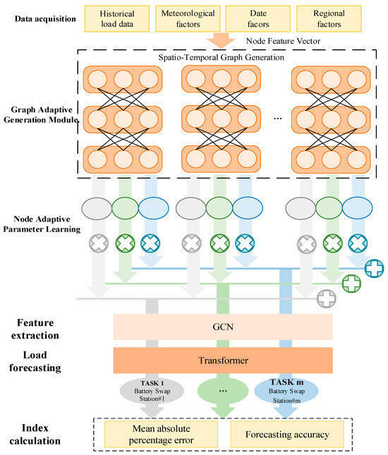 To address the challenge of power absorption in grids with high renewable energy integration, electric vehicle battery swapping stations (EVBSSs) serve as critically important flexible resources. Current research on load forecasting for EVBSSs primarily employs Transformer models, which have increasingly shown a lack of adaptability to the rapid growth in scale and complexity. This paper proposes a novel data-driven forecasting model that combines the geographical feature extraction capability of graph convolutional networks (GCNs) with the multitask learning capability of Transformers. The GCN-Transformer model first leverages Spearman’s rank correlation to create a multinode feature set encompassing date, weather, and historical load data. It then employs data-adaptive graph generation for dynamic spatio-temporal graph construction and graph convolutional layers for spatial aggregation tailored to each node. Unique swapping patterns are identified through node-adaptive parameter learning, while the temporal dynamics of multidimensional features are managed by the Transformer’s components. Numerical results demonstrate enhanced accuracy and efficiency in load forecasting for multiple and widely distributed EVBSSs.