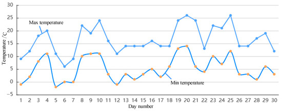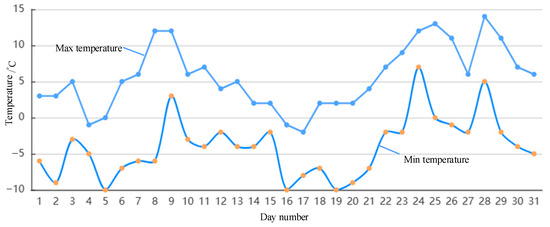 Figure 12 graphically represents the temperature trends for two distinct months in the city. The line chart delineates the daily temperature extremes, with yellow markers indicating the lowest temperatures and blue markers signifying the highest temperatures of each day.
