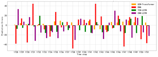 Beyond the aforementioned Transformer model, a comparative study was conducted to showcase the predictive performance of various established models in the context of charging station compliance. The comparative results are presented in Figure 14 and Figure 15. To ensure the generalizability of the findings, a random moment’s station load value from the load time curves of 46 charging stations was selected for overall indicator comparative analysis, with the detailed accuracy data delineated in Table 5. The findings indicate that when the scale of the charging station escalates to incorporate complex multinode interactions, the efficacies of the models currently in extensive use exhibit notable deficiencies.