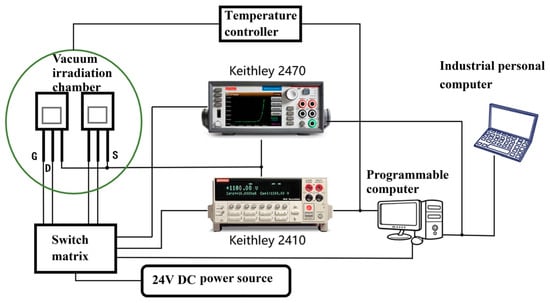 A block representation of the experimental setup (shown in Figure 1) was constructed to monitor the drain-source and gate-source currents of the irradiated device in real time. Two Keithley source measure units (SMUs), models 2470 and 2410, were used to bias gate (VGS) and drain (VDS), respectively. Furthermore, model 2410 was used to monitor the drain currents (ID). The gate and drain were connected to the positive poles of the two source meters, and the source was connected to the negative poles of the two source meters simultaneously to monitor the two currents separately. The source meters were remotely controlled by a host computer for program control and data storage. Before the beam was turned on, the gate and source of the SiC MOSFET were short-circuited, i.e., VGS = 0 V and VDS = 100 V. After irradiation started, the process stopped when the total amount of incident ions reached 1 × 10⁶ cm−2. Next, the irradiation continued after increasing the VDS until the drain-source current exceeded 1 × 10−4 A, indicating the occurrence of SEB, and the irradiation experiment ended.