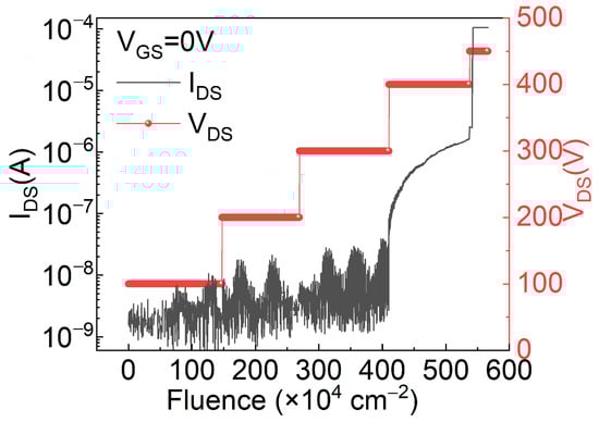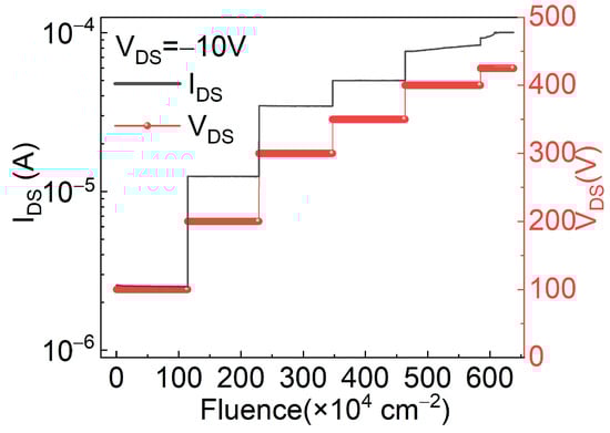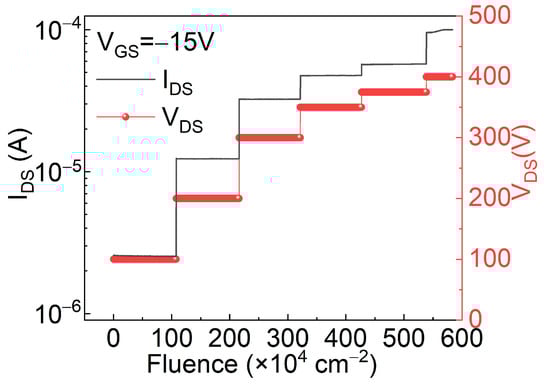 The experiment was conducted again with the gate-source bias changed. Figure 4 shows the drain current and VDS values of the SiC MOSFET with respect to the fluence with VGS = −15 V. In this case, the heavy ion injection rate was 1.15 × 104 cm−2·s−1. As shown in the figure, when VDS = 400 V, the drain current began to increase with increasing incident injection, and SEB occurred after approximately 20 s of cumulative irradiation under these conditions. Similarly, when the initial VDS voltage was 100 V, the drain current was maintained at a high level, and the drain current was stable under different bias conditions. Figure 4 shows that the sample can maintain a relatively stable working state when VGS = −15 V and VDS < 375 V, and that it will not respond sensitively to irradiation.