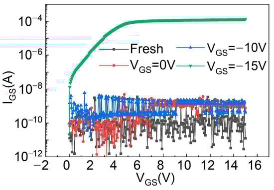 Comparing the SEBs of the samples under three gate-source bias conditions, Figure 2, Figure 3 and Figure 4 show that the SEB threshold voltage decreases with increases in the absolute value of the negative bias of the gate-source voltage. This is because different gate-source biases cause different degrees of damage to the internal oxide layer of the SiC MOSFET []. A post-irradiation gate stress (PIGS) test was carried out to explore the relationship between the potential damage to the gate oxide and the gate-source bias voltage VGS during the irradiation, and the results are shown in Figure 5. After irradiation with VGS = 0 V, the gate leakage current IGS had no obvious change; after irradiation with VGS = −10 V, the device IGS was one order of magnitude larger than that before irradiation; after irradiation with VGS = −15 V, the IGS changed significantly with the gate voltage, showing a trend of stabilizing at 1 µA, which indicates that particle irradiation under negative VGS conditions causes the SiC MOSFET to have more serious oxide potential damage, verifying the conclusion that oxide potential damage becomes more serious with increasing gate-source bias stress.
