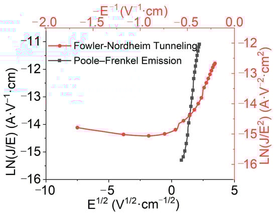 ln(J/E)~E1/2 and ln(J/E2)~(−E−1) characteristic curves (VGS = −15 V).