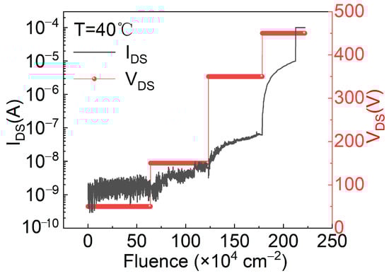 Figure 2 shows the changes in the gate current, drain current, and VDS of the SiC MOSFETs with respect to the irradiation time during the heavy ion irradiation experiment. The heavy ion injection rate in this round of experiments was 1.18 × 104 cm−2·s−1. As shown in the figure, when VDS < 300 V, the drain current of the device remains small and relatively stable, with minimal changes in VDS. Above VDS = 400 V, the drain current rapidly increases by three orders of magnitude, and when the voltage reaches VDS = 450 V, the drain current instantly spikes, leading to SEB.