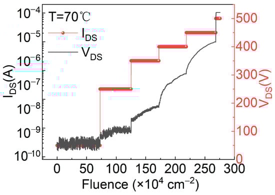 Different temperature points were selected for the irradiation experiments to explore the relationship between the SEB sensitivity and temperature of the SiC MOSFET. Figure 7 and Figure 8 show that the SEB voltage of the device at 40 °C is 450 V, and the SEB voltage of the device at 70 °C increased by 50 V, which shows that different temperature environments cause the SEB threshold voltage of the sample to change. Furthermore, in the experiment at 70 °C, the experimental SiC MOSFET showed a significant decrease in leakage ID at an early stage. When VDS = 400 V, the ID increased rapidly, by two orders of magnitude, and SEB occurred when VDS was 500 V. However, in the 40 °C environment, the leakage current of the sample increased rapidly when the VDS was 450 V, and it was determined that SEB occurred. This phenomenon shows that with increases in the working environment temperature of the SiC MOSFET, the SEB threshold voltage increases. Additionally, the SiC MOSFET experiences leakage degradation before the SEB occurs at any temperature when VGS = 0 V.
