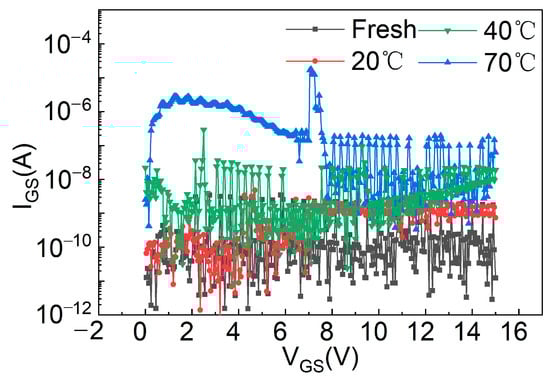 Based on the PISG test, the relationship between the potential damage degree of the oxide and the environmental temperature was explored. Figure 9 shows the PIGS of the SiC MOSFET with irradiation at different temperatures. The results revealed that the gate leakage current of the SiC MOSFET increased to varying degrees after it was irradiated by heavy ions. However, a high temperature of 70 °C caused the gate leakage current of the device to increase significantly, and it fluctuated violently with increasing gate voltage stress. The leakage current of the SiC MOSFET irradiated at 40 °C was significantly greater than that of the device irradiated at 20 °C. A higher VDS is required for catastrophic SEB damage to the devices at 70 °C, which leads to the generation of a greater instantaneous electric field during its SEB, as well as to more severe gate defects. Combined with Formula (1), it can also be proven that due to the defects introduced by irradiation, the gate leakage current mechanism of the SiC MOSFET changes to a PF emission model. At higher temperatures, the gate oxide layer of the device is more damaged, and the PF emission current increases, resulting in a larger gate leakage current.
