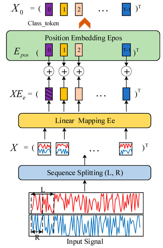 The Transformer-based encoder adopts a modular architecture, as shown in Figure 4, which allows each layer to work independently. Communication between layers is facilitated through an attention mechanism, providing flexibility in adjusting the size and complexity of the model. In this setup, each module has a input layer, which accepts the component of the signal data as input. These components are divided into blocks with the size of , with each block undergoing linear embedding after the addition of positional information embeddings.