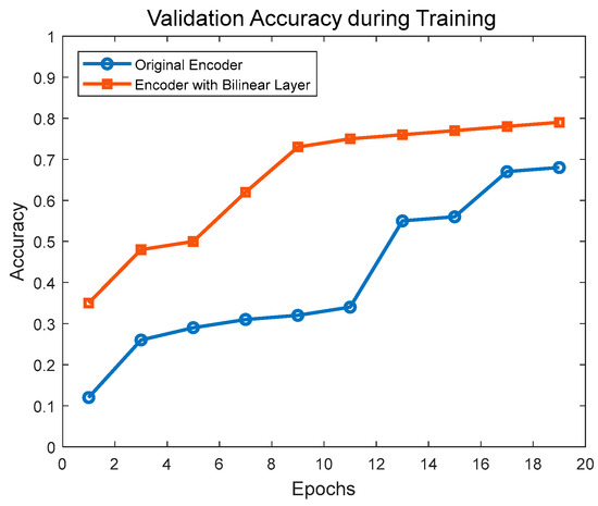 Using a standard architecture as the base model, one version utilizes the original encoder, while the other employs an improved encoder. Figure 8 illustrates the data for each epoch during the training process. Specifically, the figure displays the average accuracy on the validation set when using the improved encoder compared to the original encoder.