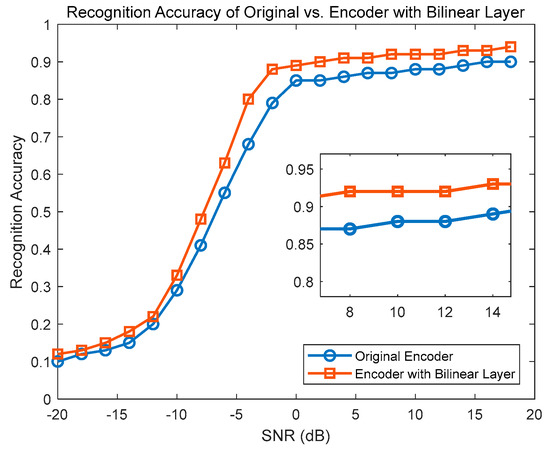 Figure 9 illustrates that under different SNR levels, the curve of the improved encoder with the Bilinear layer consistently remains at the top of the graph, maintaining or even enhancing the model’s modulation recognition accuracy compared to the original encoder. The Bilinear layer is typically used to enhance the model’s feature extraction capabilities in classification tasks, thereby improving the overall performance of the model. By incorporating the improvement in the Bilinear layer, significant enhancements in modulation recognition accuracy of the encoder can be achieved under various SNR conditions. This improvement is of great significance for enhancing the robustness and accuracy of the model in noisy environments.