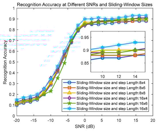 In Figure 10, the combination of a sliding-window size and step length of 16*8 achieves the highest recognition accuracy, aiding the model in effectively capturing the discriminative features used for classification. This indicates that larger window sizes can help the model capture a wider range of information from the input data, while larger step lengths can accelerate the model’s movement and processing speed on the data. This contributes to the model’s comprehensive understanding and differentiation of features within the input data.