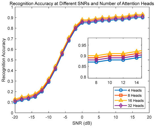 In Figure 11, when the number of attention heads is 16 (H = 16), a good balance can be achieved, enabling the model to capture the crucial information and patterns within the input sequences without overfitting the training data, resulting in optimal recognition performance. A smaller number of attention heads (H = 4) may limit the model’s expressive and learning capabilities, leading to poor performance in handling complex sequences and capturing long-distance dependencies. On the other hand, a larger number of attention heads (H = 32) can provide more linear spatial representation and enhanced relationship capturing ability, yet often at the cost of increased computational complexity and potential overfitting, especially with insufficient training data or inadequate regularization.