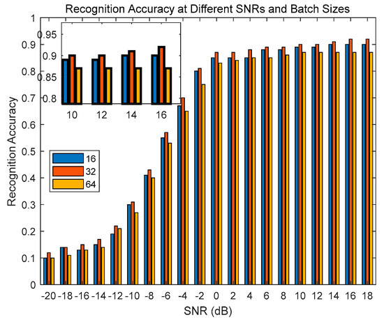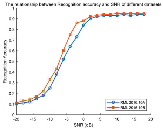 In Figure 16, the recognition accuracy values shown are based on the average of multiple modulated signals, rather than using only one modulated signal. Figure 16 also demonstrates the comparison of average recognition accuracy under different SNR conditions. For the Transformer-based network architecture, increasing the dataset size has a notably positive impact on performance. The RML2016.10B dataset offers richer and more diverse training samples compared to RML2016.10A, thus resulting in better recognition accuracy. Under high-SNR conditions, the performance of the two datasets may be relatively similar because of a clearer distinction between the signal and noise. In the case of a low SNR, some minor differences may be observed, particularly in recognition rates of complex modulation schemes, where the boundary between the signal and noise becomes blurred.