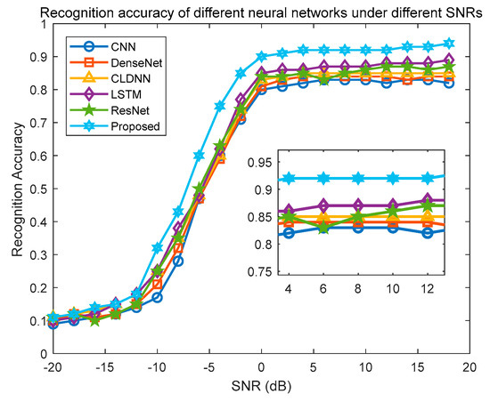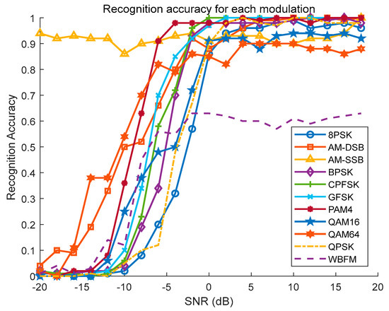 Relationship between recognition accuracy of different modulation types and SNR.