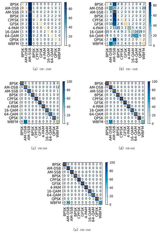 Figure 15 illustrates the recognition accuracy of CTRNet across various modulation types and different SNR levels. These curves depict how CTRNet’s ability to recognize different modulation types varies with SNR conditions. Typically, the recognition accuracy should improve with increasing SNR, but there may be performance degradations or fluctuations within certain SNR ranges, which is due to increased noise making signal recognition challenging. This variability might also reflect the algorithm’s stability under varying signal strengths. Notably, under high-SNR conditions, WBFM and AM-DSB exhibit relatively low recognition accuracy and are prone to mutual confusion. This could stem from similar features in their generated data or specific challenges posed by noise conditions. The recognition accuracy of digital modulation types (such as QAM, PSK, etc.) improves with increasing SNR. This is because a higher SNR provides clearer signal features, making it easier for the algorithm to distinguish between different modulation types. Different modulation types may present varying levels of complexities and challenges in recognition. For instance, the distinction between QAM16 and QAM64 may decrease when the SNR decreases, because noise under lower-SNR conditions may cause confusion and the misclassification of constellation points.