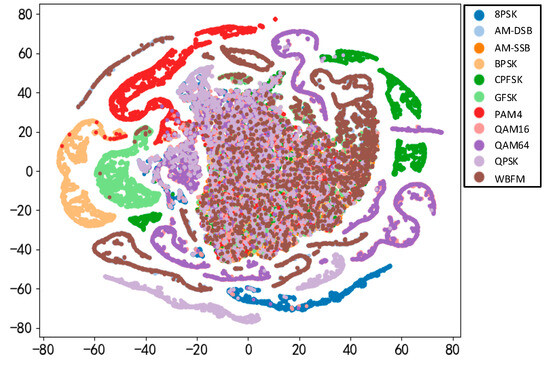 Figure 17 presents t-SNE visualizations of fully connected layer features. It illustrates that in multipath fading channels, classification errors typically arise within different modulation orders of the same mode. Samples of the same category are closely clustered, indicating successful grouping by the model and thus good classification performance. Conversely, samples from distinct categories exhibit significant separation, further demonstrating effective classification. However, some overlap between different categories suggests occasional difficulty in distinguishing them. Notably, the method shows limitations in distinguishing WBFM, suggesting potential for optimization. Isolated points in the visualization might signify anomalies or noise, impacting classifier performance; addressing these outliers could enhance model effectiveness. In summary, closely clustered and well-separated categories indicate strong classification performance, while overlap or outliers may necessitate model refinement.