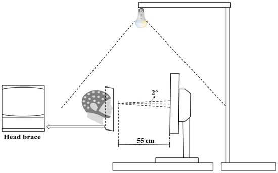 During this experiment, a 60 Hz refresh rate display with 4 K high definition was utilized. The screen brightness, illuminance, and CCT of the controllable table lamp irradiation area were scaled using the HOPOO spectral brightness analyzer. During the trials, the monitor was placed 55 cm away from the subjects, and the eyes of the subjects looked straight at the center of the screen. The head of the subject was fixed using a head brace with adjustable height in order to ensure that the subject did not disturb the measurement of EEG and eye movement data in the experiment. The visual angle of paradigm scintillation was 4°, and its diameter was 148 pixels, which were set by referring to the relevant literature [,]. The eye tracker was pasted at the bottom of the screen. The stimulus paradigms were presented by MATLAB 2016b with the Psychophysics Toolbox []. The international SSVEP stimulation paradigm—light scintillation paradigm—was used in this experiment to help others reproduce the experiment. The stimulation mode of the paradigm was the brightness, which changed from black to white. The paradigm was modulated by a sine wave, and the stimulation frequency was 7.5 Hz.