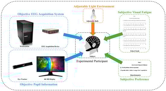 The setting of experimental indicators is considered from a systematic perspective, in which subjective visual fatigue and subjective preference are set to reflect the subjective quantification of visual fatigue users, and pupil data acquisition and EEG activity acquisition are set to reflect the objective quantification of visual fatigue of participants from the perspective of the optic nerve and cerebral cortex, respectively [,]. In the subsequent analysis, there will be a unified comfort index to quantify the overall visual experience of subjects in the entire light environment.
