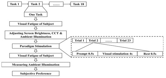 Each experiment corresponded to a different indoor light condition, and the subjects needed to experience all 18 environments. Each experiment included 23 trials, and each stimulation trial was 4.5 s; the rest between trials was 0.5 s, meaning that a complete trial took 5.0 s.
