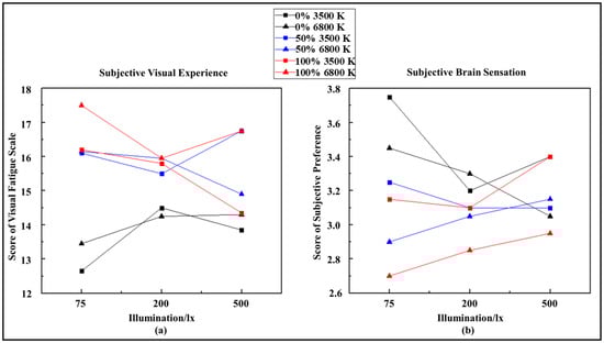The larger SVF value accounts for the higher subjective fatigue and the worse visual experience. Figure 4a can be analyzed as follows: from the perspective of screen brightness, the subjective visual experience is the best at low screen brightness; on the contrary, the average SVF of subjects being the highest at high screen brightness means the experience is the worst in this case, which may be related to the usual eye care habits of participants; from the perspective of CCT, the SVF at 3500 K is slightly less than 6800 K, which shows that subjects feel more comfortable under a light environment of warm color; from the perspective of illuminance, the subjective visual fatigue under medium brightness–warm light and high brightness–cold light decreases first and then increases with the increase in illuminance. The trend under low brightness–warm light is the opposite. At the same time, fatigue is directly proportional to illuminance under low brightness–cold light but inversely proportional to illuminance under medium brightness–cold light and high brightness–warm light, which indicates that greater environmental illuminance does not always lead to a better visual experience.