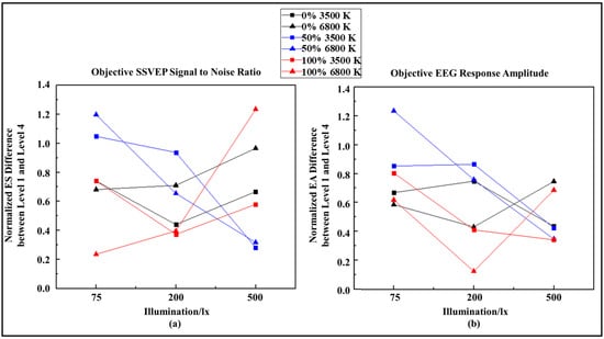 The greater the value of ES, the more visual fatigue the subjects produce in this process and the worse the environmental experience. As Figure 5a and Figure 6 show, a lower brightness does not mean a better visual experience, which indicates that EEG is not sensitive to screen brightness. Regardless of the brightness, the best visual experience is achieved at 500 lx under warm color light. This shows that when the illuminance is high, and the CCT is low while using computers in the indoor office environment, regardless of what screen brightness is used, it can provide the best visual experience effect for users.