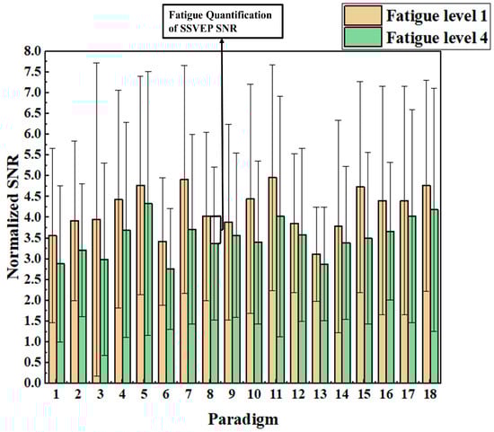 A comparison of the mean values and SD of normalized SNR between fatigue level 1 and fatigue level 4 for 18 stimulus paradigms for 20 subjects. The statistics were assessed using a one-way ANOVA.