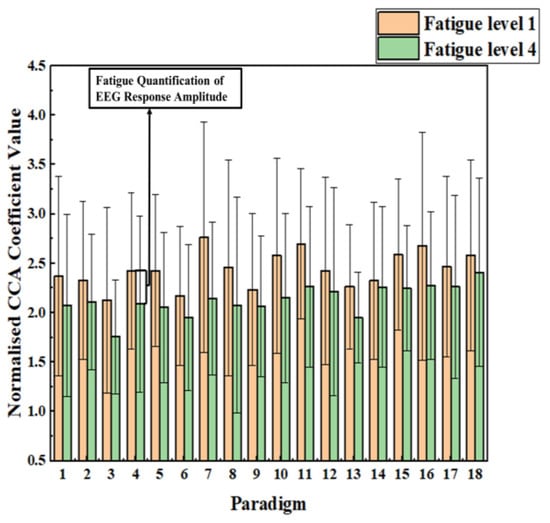 A comparison of the mean values and SD of the normalized CCA coefficient value index between fatigue level 1 and fatigue level 4 for 18 stimulus paradigms for 20 subjects. The statistics were assessed using a one-way ANOVA.