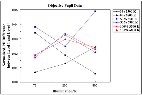 The greater the value of the difference in PD, the more fatigue the subjects produce in this process and the worse their comfort. As Figure 8 and Figure 9 show, fatigue is the lowest at low brightness, which shows that the pupil diameter is affected by the screen’s brightness. Eyes clearly prefer a darker screen. Fatigue increases with the increase in illuminance at low brightness and high CCT. On the contrary, the increase in illuminance has little effect on fatigue at high brightness. The objective pupil data show that the screen brightness has a direct relationship with human visual fatigue, and this effect is greater than that of illuminance on human visual fatigue. When designing an indoor light environment, a designer should not only consider the illuminance and CCT. The guiding suggestions for the brightness settings of the screen also play an important role in avoiding greater visual fatigue.