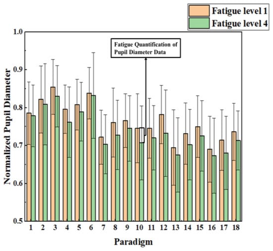 A comparison of the mean values and SD of the normalized pupil diameter index between fatigue level 1 and fatigue level 4 for 18 stimulus paradigms for 20 subjects. The statistics were assessed using a one-way ANOVA.