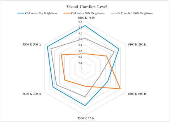 Figure 10 shows that in most of the light environments with the same illuminance and CCT, adjusting the screen brightness to 0% can obtain the highest visual comfort value and provide the best visual experience for users. Moreover, a higher screen brightness can provide users with better visual comfort than a medium screen brightness under most conditions. The visual effect of medium screen brightness is only the best under the condition of cold-color light and the highest illumination. In summary, when working in an indoor light environment in modern buildings, it is best to set the screen brightness of electronic equipment to a low brightness.
