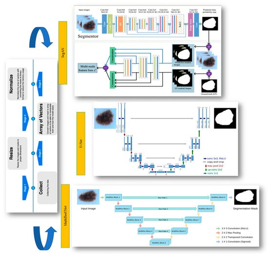 In recent years, several advanced methods have emerged for dermoscopic image segmentation that build on or extend the foundational techniques provided by models like U-Net, SegAN, and MultiResUNet. These newer methods often incorporate innovations in deep learning architectures, attention mechanisms, and transfer learning to improve segmentation performance. DeepLabV3+ uses dilated convolutions to capture multi-scale contextual information and a depthwise separable convolution for efficient feature extraction. It provides detailed and accurate segmentation by integrating context from different scales to deal with handling variations in lesion sizes and shapes [41]. Attention U-Net enhances the standard U-Net by incorporating attention gates that help the model focus on the relevant parts of the image. Attention gates selectively emphasize the features that are important for the segmentation task, improving the model’s ability to differentiate between lesions and the background [42]. UNet++ introduces nested skip pathways and deep supervision to improve model performance by refining feature extraction and enhancing the learning of multi-scale features [43]. Attention-based Residual U-Net combines U-Net with attention mechanisms and residual connections. It uses attention blocks to focus on relevant features and residual connections to improve training stability and performance [43]. Attention Residual U-Net integrates residual learning with U-Net architecture [44]. ResUNet uses residual blocks within the U-Net framework to address vanishing gradient issues and improve model training. It enhances feature extraction and improves segmentation of complex lesions [45]. V-Net applies volumetric (3D) convolutions to handle data with three-dimensional context to capture spatial context in three dimensions [46]. DenseNet-UNet combines DenseNet with U-Net architecture to uses dense connections to improve feature reuse and gradient flow, enhancing segmentation accuracy [47]. SWIN-UNet uses transformer blocks integrated with U-Net for segmentation to handles complex patterns and fine details effectively [48]. TransUNet combines Transformer-based architecture with U-Net and integrates the Transformer’s self-attention mechanism with the U-Net structure to capture both local and global features [49].