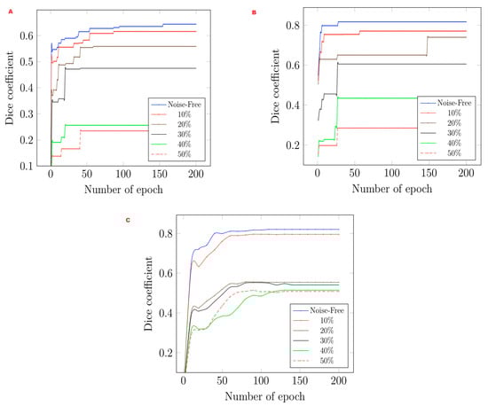 Dice results at different Gaussian noise levels through the number of epochs for (A) U-Net, (B) SegAN, (C) MultiResUNet DNN techniques.
