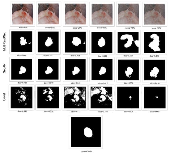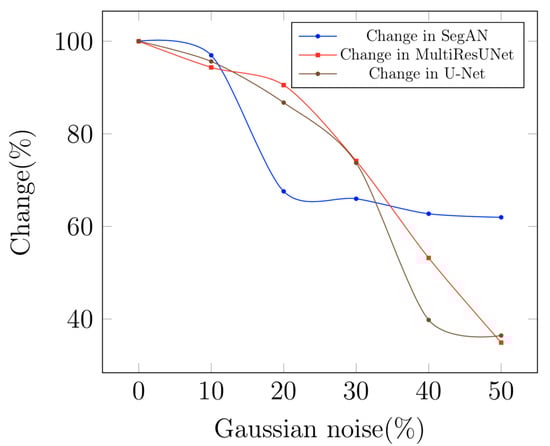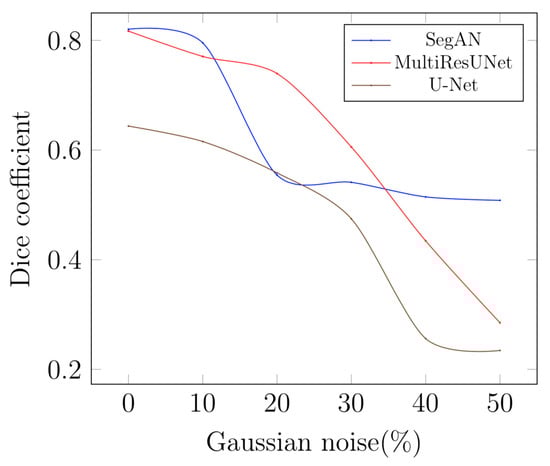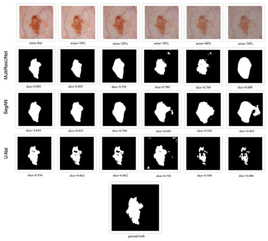 The experiments show that both SegAN and MultiResUNet achieved almost the same Dice coefficient result for the noise-free images, but vanilla U-Net did not achieve similar results in terms of the same similarity metrics. It is not as successful as the others. MultiResUNet is slightly more successful than SegAN if they are compared using the Jaccard coefficient. The detailed results are given in Table 1, Table 2 and Table 3 through statistical metrics. Although the Dice results of SegAN (Figure 2 and Figure 3) and MultiResUNet (Figure 4 and Figure 5) are very close for the noiseless datasets, the Dice results differ for all models as the noise level increases. Both MultiResUnet and SegAN achieved their best results around the epoch size of 50. The results were found similar after this point. Figure 6, Figure 7 and Figure 8 point out the Dice results of models at different levels of epoch size. As the number of epochs increases, we note that the increase in the Dice score looks similar in U-Net and SegAN. However, MultiResUNet differs with its ability through epoch size. Table 1, Table 2 and Table 3 show the evaluation results of dermoscopic images from the evaluation dataset with different statistical rates. For all DNNs, the scores of the Dice and Jaccard indices decrease, and the noise level increases. However, statistical parameters are less affected by noise due the nature of the melanoma properties in the ISIC 2017 dataset. Figure 9 points out how Dice coefficient rates drop with Gaussian noise levels. Furthermore, Figure 10 shows the results of detection variations with different models. We remark that SegAN is more robust than vanilla U-Net and MultiResUNet at increased levels of Gaussian noises. When the noise level is 50%, the Dice results of MultiResUNet decreased up to 28%, U-Net’s decreased up to 23%, while SegAN’s decreased up to 53%. SegAN introduces fake skin lesions during the generator level, and the discriminator makes a decision after the training as to whether the test image is a lesion. The noise added during the training phase of SegAN makes the model more successful against noisy data. Figure 10 shows the change in segmentation accuracy through three DNNs where additive noise levels increase. We note that SegAN is more robust than vanilla U-Net and MultiResUNet at increased levels of Gaussian noises. Although it is not possible to create a model that fits all dataset, the main objective is to present a model that best generalizes them. Figure 9 and Figure 10 are the outputs obtained by evaluating two pictures with two models with different levels of noise. While SegAN gives more successful results for the image in Figure 9, MultiResUNet is more successful with the image in Figure 10. As can be seen from that comparison, there is no precise superiority of the models to each other for certain data.