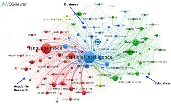 The rapid widespread adoption of ChatGPT after its release has demonstrated its tremendous power in potential uses in different areas, ranging from technical assistance such as coding, essay writing, and business letters to customer engagement, as well as many others [9]. Despite the powerful capacity of ChatGPT to help people with various writing tasks and experiments engendering both positive and adverse impacts, society has critical concerns about allowing users to cheat and plagiarize, especially in academia and education communities [10], potentially spreading misinformation and enabling unethical business practices, as well as other ethical issues [11,12]. Figure 1 shows the statistics of publications on the ethics of ChatGPT until 12th May 2024. The data were collected from Dimensions with keywords “ChatGPT AND ethics”. There were 12,629 bibliometric records including 3690 preprints obtained from Dimensions. We kept tracking the trends of ethics of ChatGPT, and these numbers were 2470 bibliometric records with 839 preprints on 30th July 2023. This shows a sharp increase in concerns about the ethics of ChatGPT. Dimensions is a research database covering publications, grants, patents, clinical trials, datasets, policy documents, and technical reports (https://www.dimensions.ai/ (accessed on 12 May 2024)). Figure 1 demonstrates three obvious clusters on the ethics of ChatGPT from the society: education, business, and research on AI.
