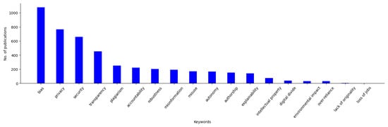 We counted the keywords of ethical concerns on ChatGPT in the abstracts of publications, as shown in Figure 1. Figure 2 shows that the most prevalent concern is bias, followed by privacy and security, as well as transparency. It also indicates that misuse and misinformation need to be adequately addressed to avoid risks from AI’s uses. Authorship and plagiarism are also key ethical concerns regarding ChatGPT because of its excellent capability to generate human-like text.
