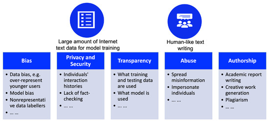 Weidinger et al. [13] summarizes the ethical risk landscape with Large Language Models (LLMs), identifying six ethical concerns: (1) discrimination, exclusion, and toxicity, (2) information hazards, (3) misinformation harms, (4) malicious uses, (5) human–computer interaction harms, and (6) automation, access, and environmental Harms. ChatGPT shares not only similar ethical issues with other AI solutions, including fairness, privacy and security, transparency, and accountability [14,15], but it may also introduce additional ethical concerns because of its specific characteristics. For example, people have difficulty distinguishing facts and fake information with ChatGPT’s human-like conversations; in education, teachers may have difficulty differentiating the authorship between humans and AI in homework; and in creative areas such as design and creative writing, ChatGPT may introduce changes to not only the authorship [16] but also the creativity of humans in the long term.