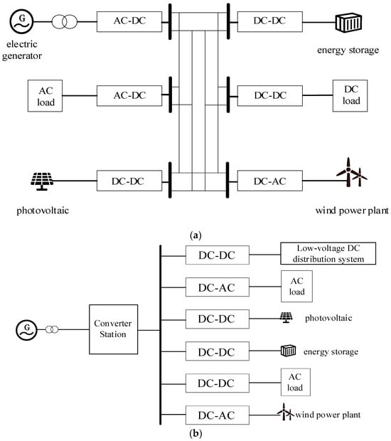 Compared to parallel-connected DC distribution systems, series-connected DC distribution systems exhibit higher line losses, limited regulation range, and difficulty in expansion. There are two circuit configurations for the parallel-connected DC distribution system: a ring structure and a tree structure, as illustrated in Figure 2.