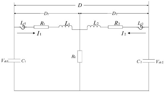 In Figure 3, the total length of the line is denoted . represents the distance from the left commutation station to the location of a single-pole grounding fault, while represents the distance from the right commutation station to the fault location, both measured in kilometers. is the voltage at the left commutation station when a short-circuit occurs in the DC distribution network, and is the voltage at the right commutation station during the short-circuit. is the transient resistance during the short-circuit. and denote the fault current values on the left and right sides during the short-circuit. , , , and represent the line resistance and inductance values from the single-pole grounding fault to the left and right commutation stations, respectively. and are the limiting reactors at the outlets of the two commutation stations. These relationships can be expressed by the following equations: